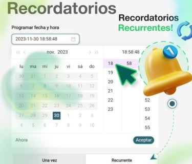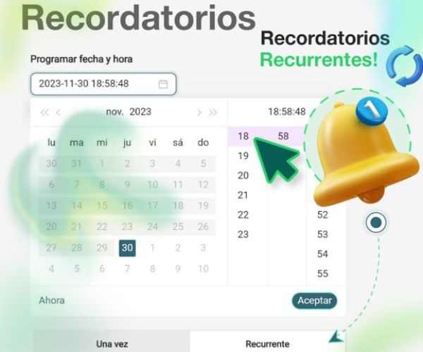 Nunca más olvidarás un recordatorio en WhatsApp. Programa envíos para la fecha, hora, minuto y segundo que necesites, ya sea el mismo día o en fechas específicas de forma recurrente.