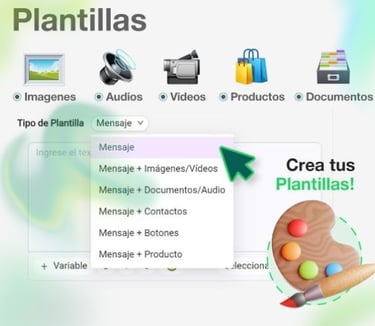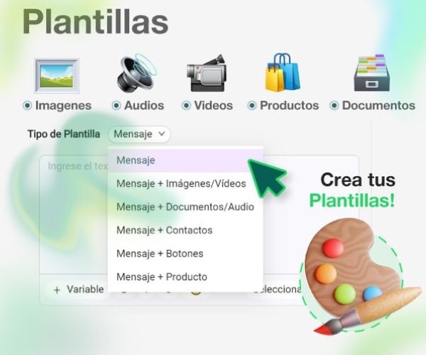 Sé más rápido y eficiente: crea plantillas con texto, variables como {{firstname}}, imágenes, audios, videos, documentos y productos de tu catálogo de WhatsApp Business.