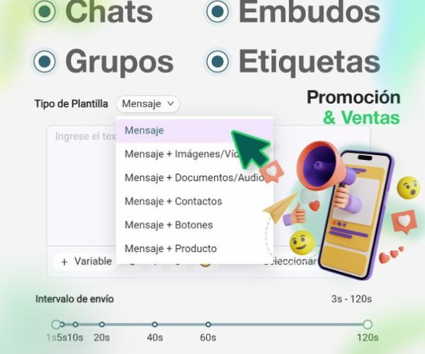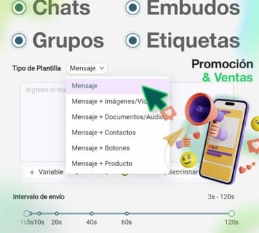 Utiliza plantillas para enviar difusiones y respuestas automáticas rápidamente. Personaliza mensajes con variables como {{firstname}} y añade imágenes, audios, videos, documentos y productos. Ajusta gestos como ‘escribiendo…’ para respuestas más naturales.