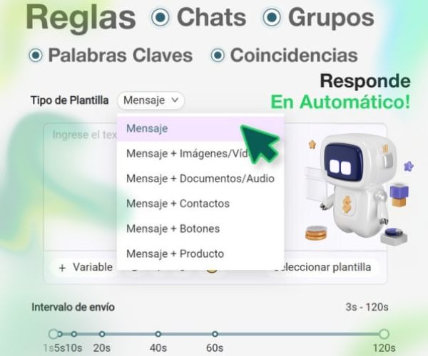 Con un solo clic, crea respuestas inmediatas y múltiples. Ajusta el tiempo de espera entre mensajes para mantener la atención de tus contactos y ahorrar tiempo.